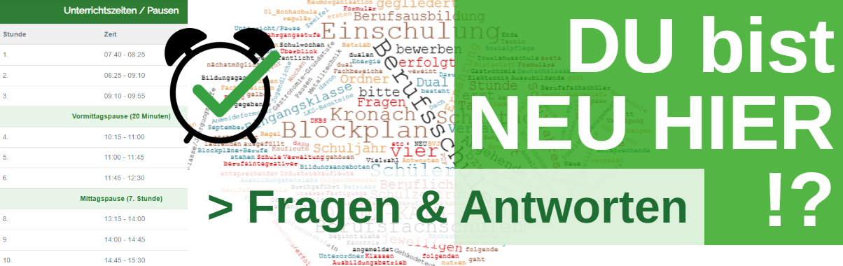 Hier findest Du erste Informationen zu unserem Beruflichen Schulzentrum, einen Überblick über unsere Schulstruktur sowie wichtige organisatorische Hinweise. Dazu gehören Unterrichtszeiten, Blockpläne, Entschuldigungsformulare, weitere Einschulungsdokumente und grundsätzliche Abläufe für Deinen Start an unserer Schule. > mehr lesen